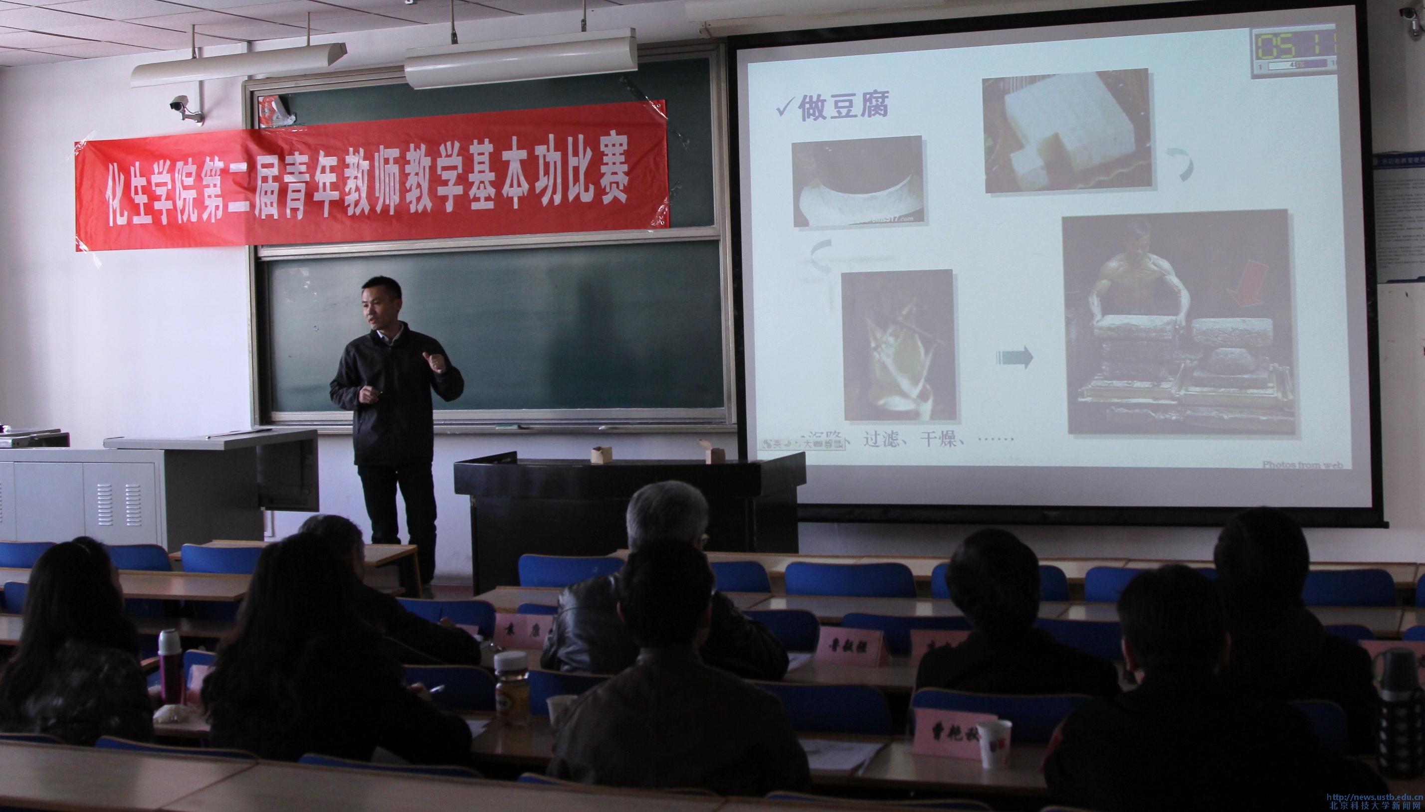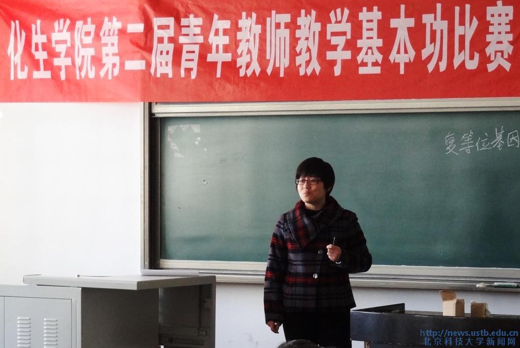 赛上,各位参赛老师按照预先排好的顺序进行教学演示。每位老师按照自己所教授的课程,选择并制定一套符合自身学术和教学特点的教案,在规定的10分钟内,现场为评委以及学生们演示教学课程。比赛中,老师们无论在选题、讲课技巧和现场发挥等方面都展现出自己的特色,表现的十分优秀。讲课中,在与同学们的问答互动以及启发式教学等方面,大部分老师都做足了准备。每位老师都围绕着属于自己那10分钟的演示时间做出了精心的准备,以饱满的热情,生动的演示,为大家带来不同以往的精彩授课。例如,宣劲松老师的《人类ABO血型》,通过精彩的实例为大家分析了基因控制血型的理论;孙长艳老师的《金属晶体结构》,通过形象的动画演示,为大家揭示出金属晶体排布和计算的规律。还有很多其他老师通过自己独特的教学方式方法,为大家现场上了精彩的一课。